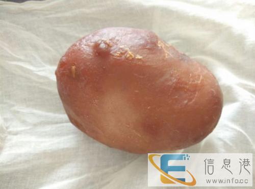 7日上午,记者在刘女士支属家见到了所谓的“鸡宝”。这个杏黄色有点椭圆形肉球样的器材,长11厘米,宽8.5厘米,高5厘米。用手摸着有弹性,内里较硬。征求主人赞成后,记者用小刀将其切开,发现内里有不规则形类似蛋黄样的器材。